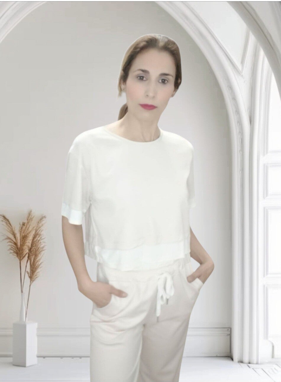 La camiseta es corta de cuello redondo y los pantalones tienen doble cinturilla con elástico y cordón ajustable y bolsillos laterales
