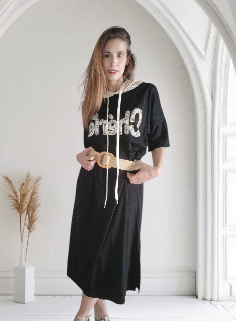 Deslumbra con este elegante vestido, realzado por una sensual abertura lateral que alarga la silueta. Su distintivo diseño frontal y su capucha dorada añaden un elemento de lujo y originalidad, convirtiéndolo en una elección perfecta para eventos especiales o para destacar con un estilo único